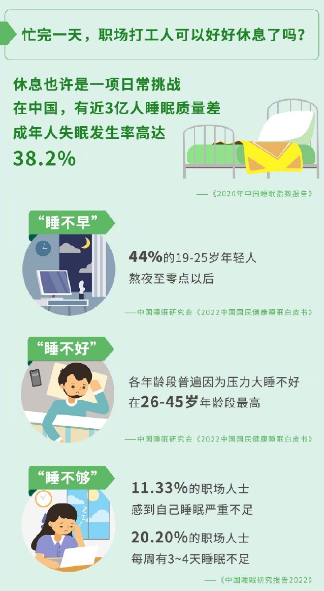 夜間休息也許是一項日常挑戰(zhàn),“搬磚人”的失眠問題亟待重視。在中國,有近3億人睡眠質(zhì)量差,38.2%的成年人面臨失眠問題。圖譜顯示,中國人面臨著“睡不早”“睡不好”“睡不夠”的睡眠問題——44%的19-25歲年輕人熬夜至零點以后,職場壓力是引發(fā)53%的人失眠的首要因素,11.33%的職場人士感到自己睡眠嚴重不足,20.2%的職場人士表示每周有3-4天睡眠不足。