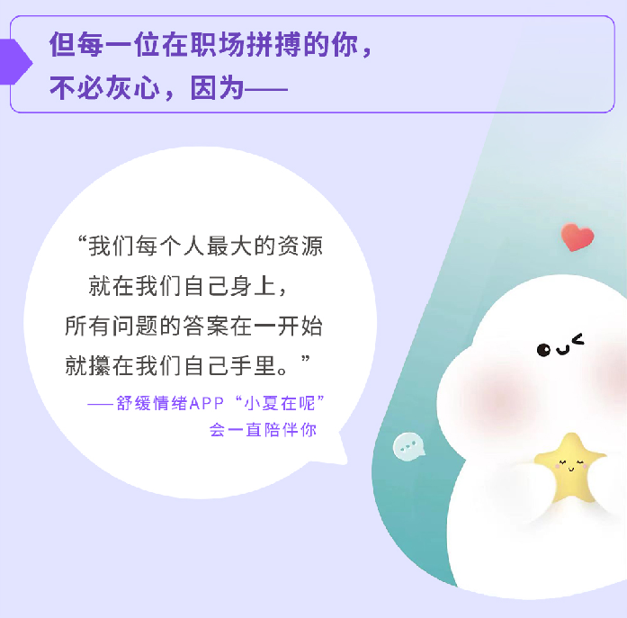 專家強調(diào),在全面復工、復產(chǎn)、復市的社會需求下,每個人都應該識別自身的心理狀態(tài)和所處的環(huán)境,采取有效的措施和手段穩(wěn)定情緒、加強溝通,堅守自身心理安全底線,快速調(diào)整心態(tài),以積極、正面的情緒迎接新生活。除主動學習心理學相關(guān)知識,專家還建議個人可借助專業(yè)、科學的心理測試工具時時檢測心理狀態(tài),如中國心理安全月中同期推出的舒緩情緒APP“小夏在呢”,也已經(jīng)成為大量用戶識別自己心理安全狀態(tài)的有效工具。