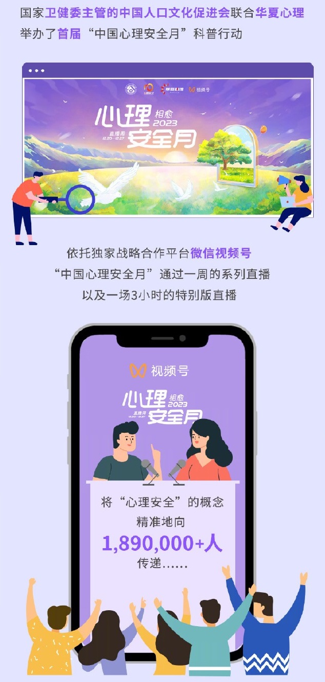 中國心理安全月首開心理安全科普先河,面向社會展開了系列心理安全概念普及工作,依托獨家戰(zhàn)略合作平臺微信視頻號通過一周的系列直播以及一場三小時的特別版直播,將心理安全的概念精準地向百萬人傳遞;以核心數(shù)據(jù)報告《中國心理安全圖譜》展示全國人群心理安全現(xiàn)狀,指明心理安全工作的重要性與意義,喚起社會大眾對“心理安全共建”的認知。人人心理安全,才有社會安全。