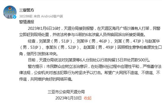 中新網(wǎng)1月10日電 據(jù)海南三亞市公安局官方微博消息,三亞市公安局天涯分局10日發(fā)布警情通報稱,2023年1月6日16時,天涯分局接到報警,在天涯區(qū)海月廣場沙灘有人打架,民警立即趕到現(xiàn)場處置,并依法將參與斗毆的6名涉案人員傳喚回派出所接受調(diào)查。