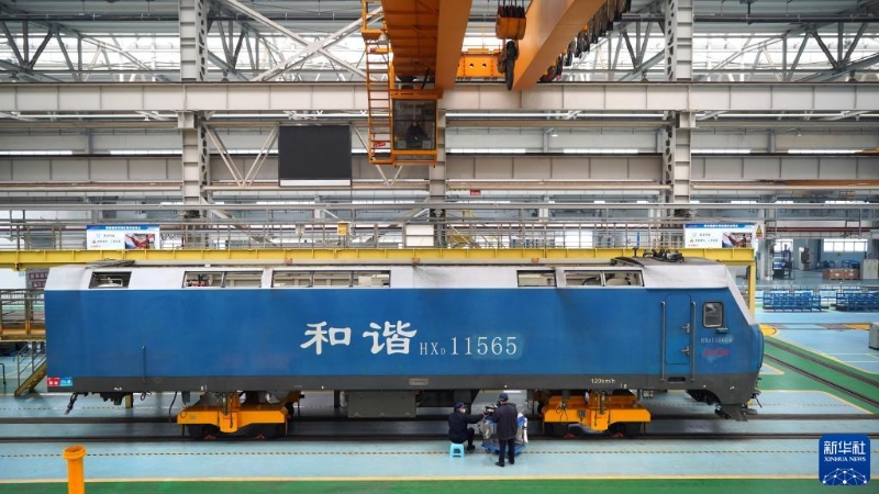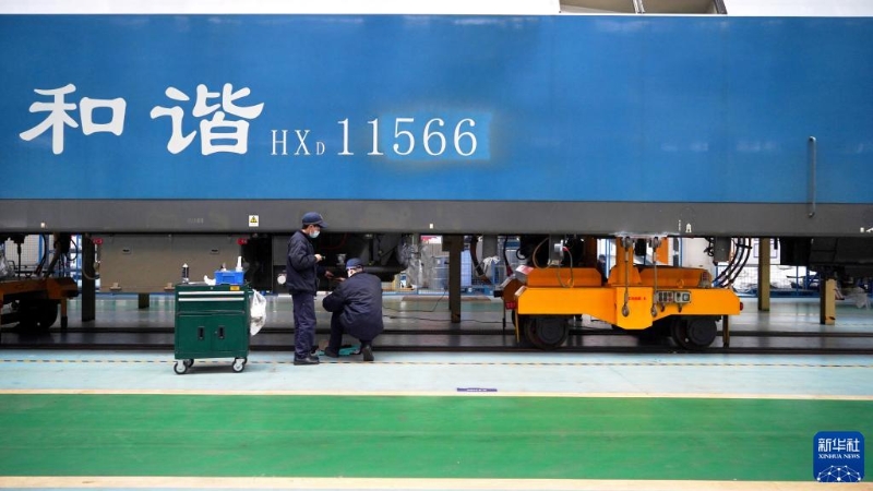 1月9日拍攝的成都機(jī)務(wù)段和諧型大功率機(jī)車(chē)檢修基地解體組裝車(chē)間,工作人員進(jìn)行檢修作業(yè)。和諧型大功率機(jī)車(chē)的一個(gè)修程需要18天。 新華社記者 薛晨 攝