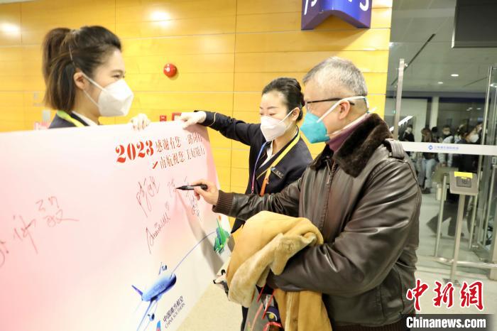 根據(jù)新措施,入境旅客在海關(guān)檢驗檢疫區(qū)只需出示健康申報碼即可快速通關(guān)。享受新政帶來的快捷通關(guān)體驗的旅客和脫下“大白”的工作人員共同在紀念簽名板上簽名留念。