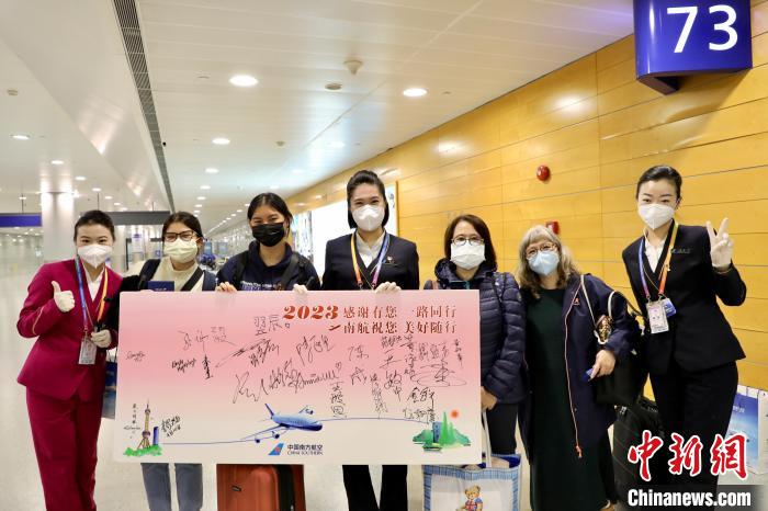 享受新政帶來的快捷通關(guān)體驗的旅客和脫下“大白”的工作人員共同在紀念簽名板上簽名留念 南航供圖
