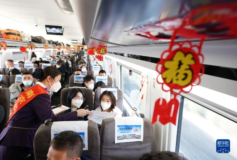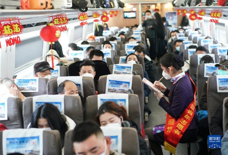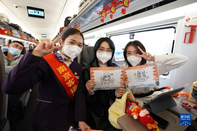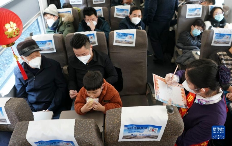 當(dāng)日,中國(guó)鐵路上海局集團(tuán)有限公司南京客運(yùn)段高鐵二車隊(duì)在D376次列車上開(kāi)展“回家路上的笑容”繪畫(huà)活動(dòng),列車員現(xiàn)場(chǎng)為旅客作畫(huà),送上新年祝福。
