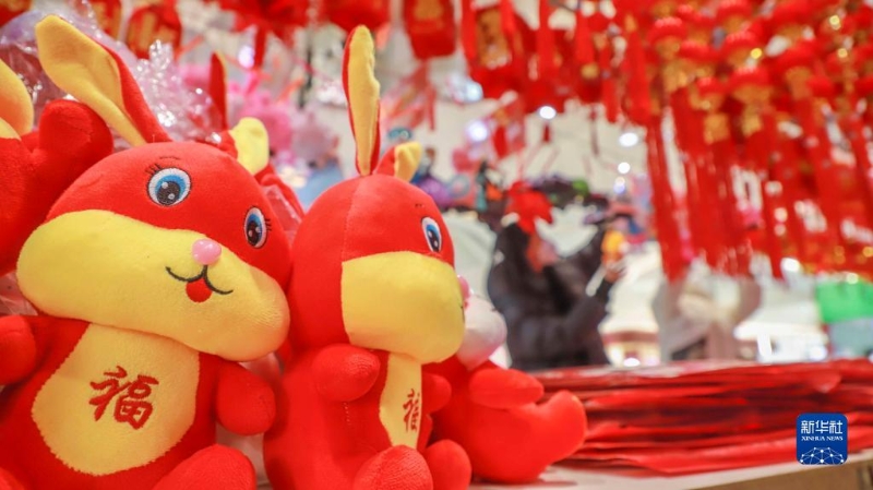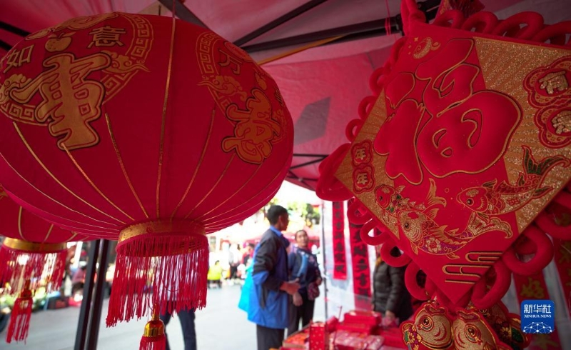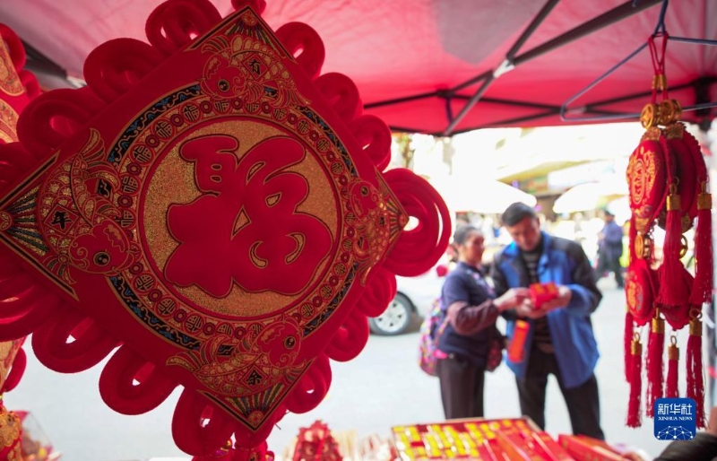 1月10日,人們在貴州省黔東南苗族侗族自治州丹寨縣年貨市場選購春節(jié)飾品。