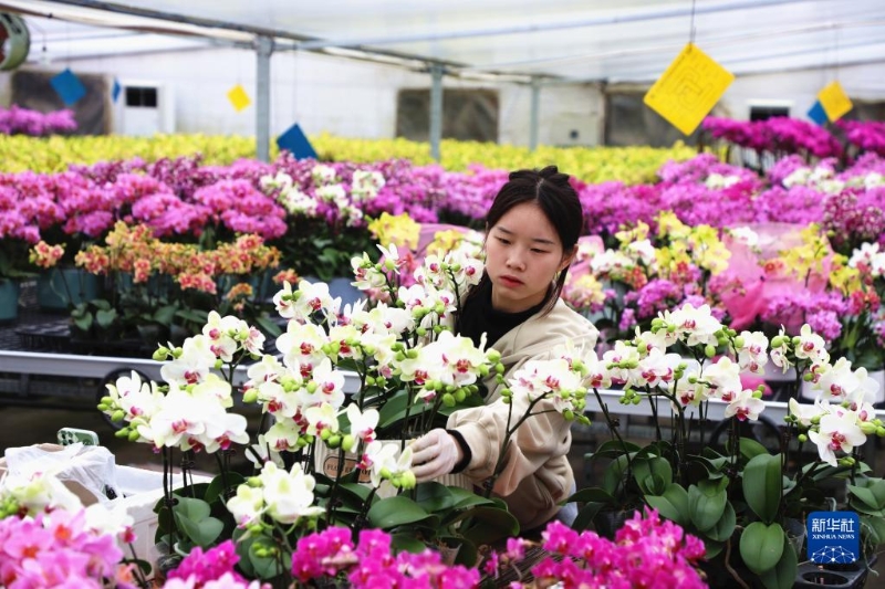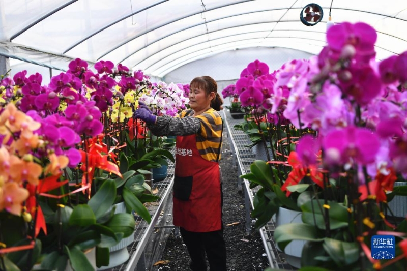 1月10日,在安徽省合肥市包河區(qū)大圩鎮(zhèn)一家花卉種植基地,工作人員在溫室大棚里打理蝴蝶蘭。