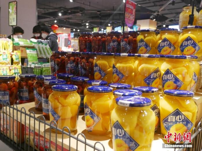 圖為在吉林市一家超市內(nèi),黃桃罐頭被擺在醒目位置。 中新社記者 石洪宇 攝