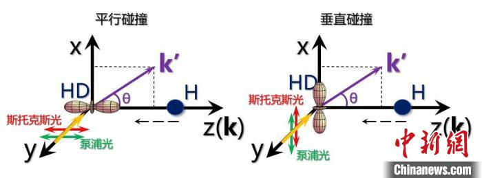 用激光控制HD分子化學(xué)鍵的方向,使其以兩種構(gòu)型與H原子發(fā)生碰撞?!≈锌圃捍筮B化物所 供圖
