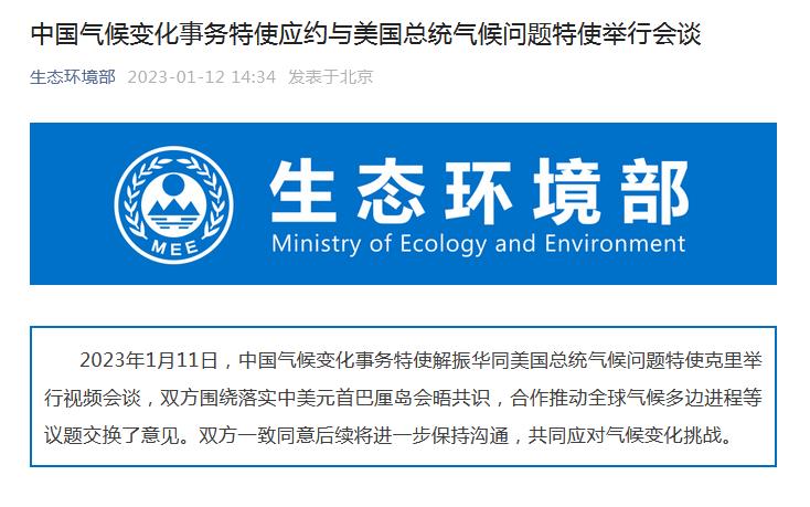 中新網(wǎng)1月12日電 據(jù)生態(tài)環(huán)境部官方微信公眾號消息,2023年1月11日,中國氣候變化事務(wù)特使解振華同美國總統(tǒng)氣候問題特使克里舉行視頻會談,雙方圍繞落實(shí)中美元首巴厘島會晤共識,合作推動全球氣候多邊進(jìn)程等議題交換了意見。雙方一致同意后續(xù)將進(jìn)一步保持溝通,共同應(yīng)對氣候變化挑戰(zhàn)。