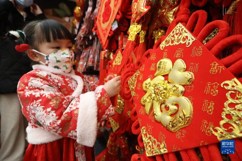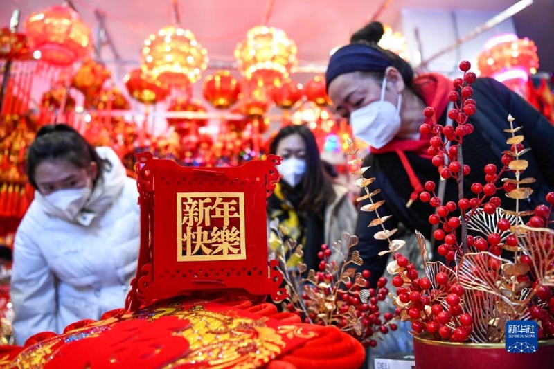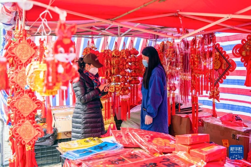 春節(jié)臨近,人們紛紛開始置辦年貨迎接節(jié)日的到來,年貨市場內(nèi)一派紅紅火火的喜人景象。新華社發(fā)(侯崇慧 攝)