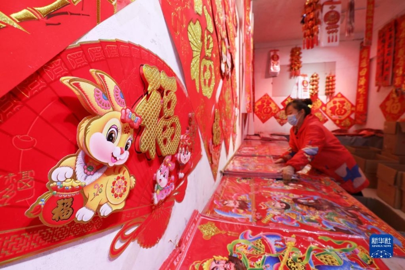 1月13日,市民在甘肅省蘭州市愛琴海小商品批發(fā)市場選購春聯(lián)、福字等兔年新春飾品。