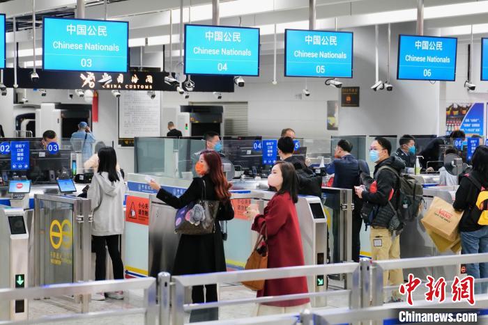 圖為離港旅客在廣深港高鐵西九龍站內(nèi)地口岸區(qū)辦理邊防檢查手續(xù)?!£愇?攝