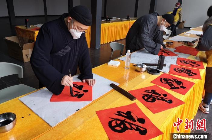 玉佛禪寺惟塵法師用不同字體書寫了“?!弊郑徒o市民們。他對中新網(wǎng)記者說:“在這個(gè)傳統(tǒng)的小年,瑞雪兆豐年,為大家題寫春聯(lián)、‘?!趾苡袃x式感,祝福大家健康吉祥、平安如意?!?/p>