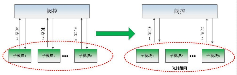 閥控設(shè)備作為柔性直流輸電工程中的關(guān)鍵設(shè)備,猶如電腦的CPU,光纖與子模塊則可視為CPU信號的傳輸通道和接收端,三者的性能直接決定整個柔性直流輸電系統(tǒng)的運行性能。隨著科技的不斷進步,柔性直流換流閥電壓等級從幾十千伏發(fā)展到±800千伏,子模塊數(shù)量越來越多,連接閥控與子模塊的光纖需求量隨之增加。上千根長達百米的光纖需要一根根鋪設(shè)在工程現(xiàn)場,不僅大幅提高柔直換流閥設(shè)備的成本,對閥控與子模塊間通訊可靠性也提出艱巨挑戰(zhàn)。