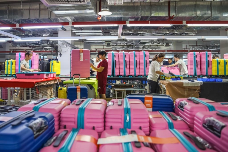2022年9月29日,在湖南省永州市藍(lán)山縣皮具箱包科技產(chǎn)業(yè)園湖南攬勝科技有限公司,工人在組裝一批出口箱包。(彭華 攝)