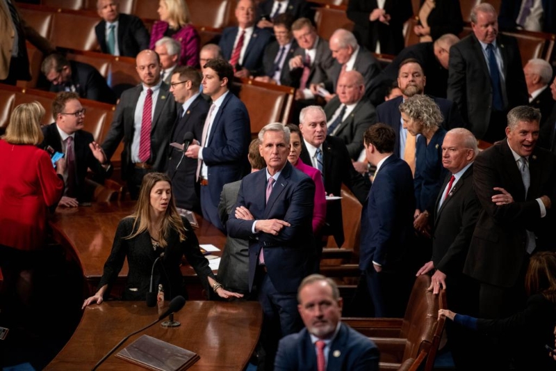 1月6日,在美國首都華盛頓,共和黨聯邦眾議員凱文·麥卡錫(中)在眾議院等待眾議長選舉表決結果。新華社記者劉杰攝