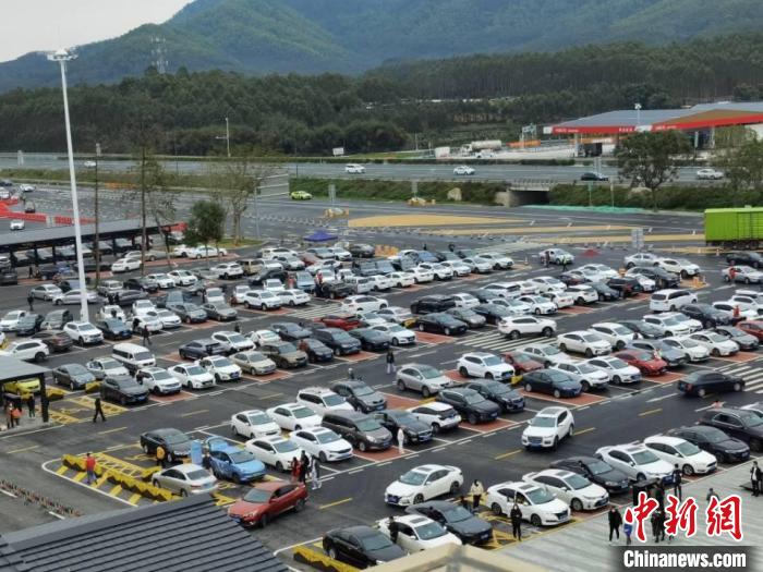 在位于僑鄉(xiāng)廣東江門的開陽高速公路梁金山服務區(qū),隨著返鄉(xiāng)客流增加,車流量和人流量明顯增多。16日中午時分,擁有1295個停車位的梁金山服務區(qū),記者在現(xiàn)場看到過半已被使用。
