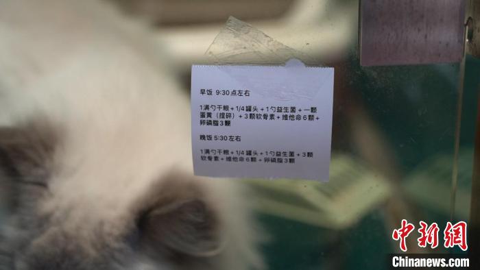 中新網上海1月16日電 (記者 鄭瑩瑩 徐明睿)“早飯9:30左右,1滿勺干糧+1/4罐頭+1勺益生菌+1顆蛋黃(捏碎)+3顆軟骨素+維他命(維生素)6顆+卵磷脂3顆?!痹谏虾F謻|新區(qū)的一家寵物店內,一只布偶貓的“玻璃房”外貼著一張精細的食譜。