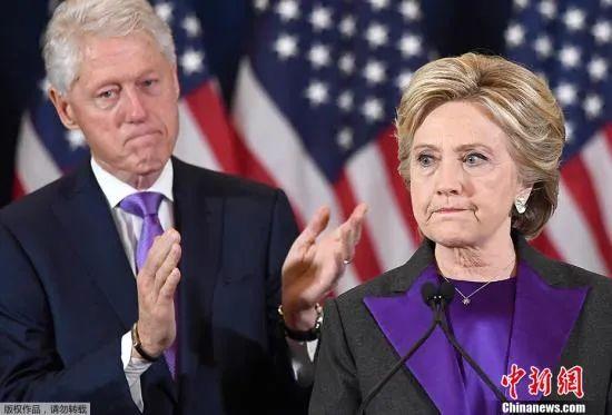 資料圖:當(dāng)?shù)貢r(shí)間2016年11月9日,美國(guó)紐約,民主黨總統(tǒng)候選人希拉里在丈夫、前總統(tǒng)克林頓陪同下,發(fā)表敗選演講。