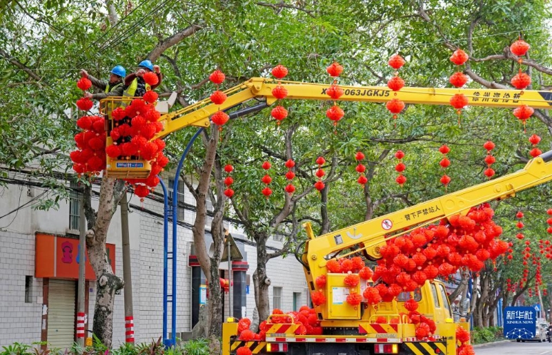 1月18日,在廣西南寧市邕寧區(qū)紅星路,市政工作人員懸掛燈籠。