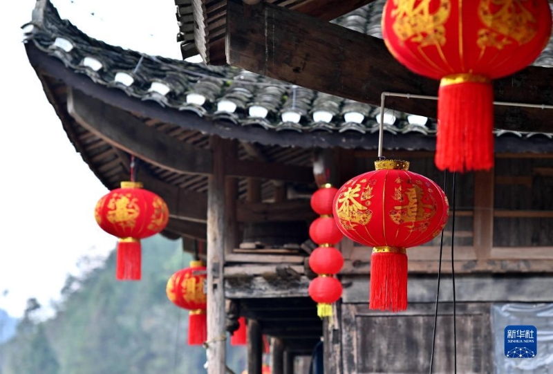 湖北省宣恩縣沙道溝鎮(zhèn)彭家寨吊腳樓懸掛著紅燈籠(1月18日攝)。