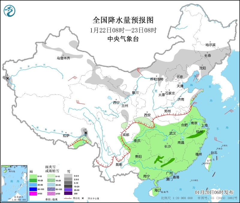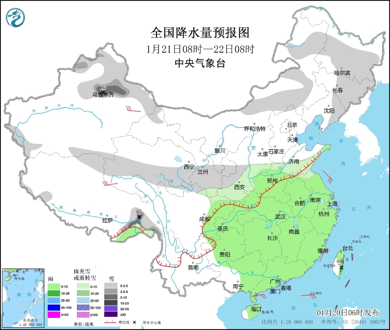 1月20日08時(shí)至21日08時(shí),新疆北部和南疆盆地、內(nèi)蒙古中東部、黑龍江西部北部和南部、吉林東北部、西藏西北部和東南部、青海南部、甘肅南部、陜西西南部、四川盆地西北部等地部分地區(qū)有小到中雪或雨夾雪,其中,西藏西部局地有暴雪。西南地區(qū)東南部、云南東南部、廣東東南部、福建南部和海南島中東部等地部分地區(qū)有小到中雨,其中,臺(tái)灣島北部和東部等地局地有大雨(25~45毫米)。新疆沿天山地區(qū)、西藏北部、內(nèi)蒙古中西部等地部分地區(qū)有5~6級(jí)風(fēng),渤海、黃海、東海、臺(tái)灣海峽、南海大部海域?qū)⒂?~7級(jí)、陣風(fēng)8~9級(jí)的偏北或東北風(fēng)(見圖1)。