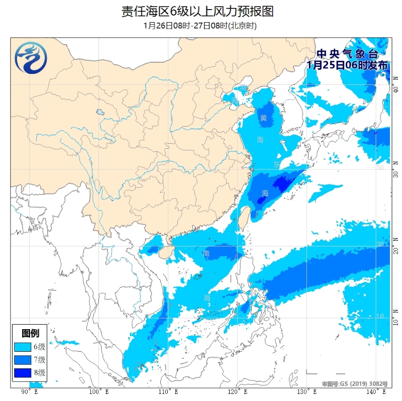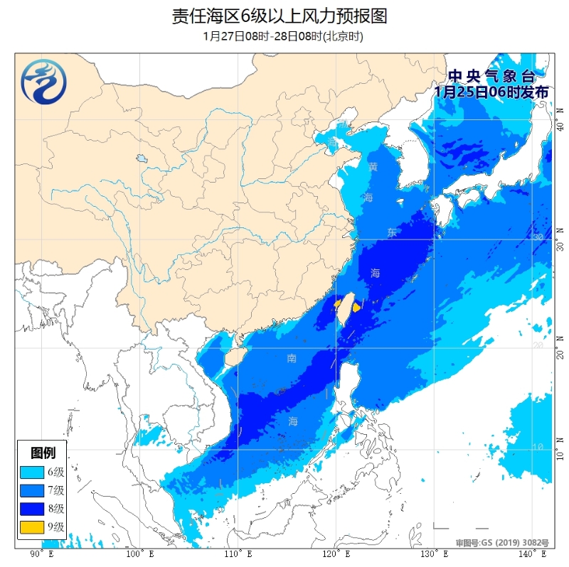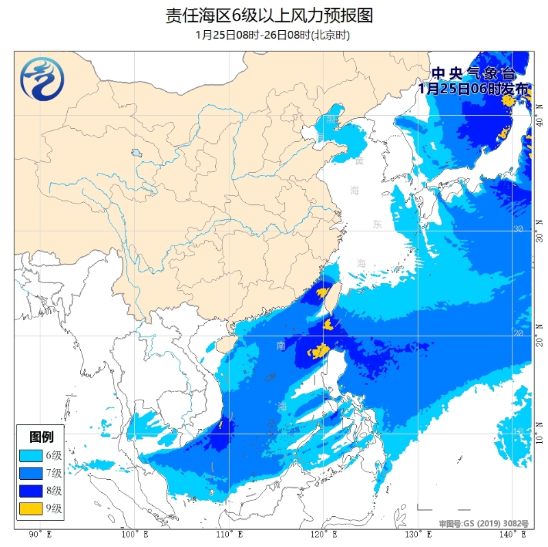 25日白天至夜間,臺灣海峽、臺灣以東洋面、巴士海峽、南海大部海域?qū)⒂?~8級、陣風9級的大風,其中臺灣海峽、巴士海峽、南海東北部和西南部的部分海域風力可達9級、陣風10~11級。中央氣象臺1月25日06時解除《海上大風黃色預警》,開始發(fā)布《海上大風預報》。