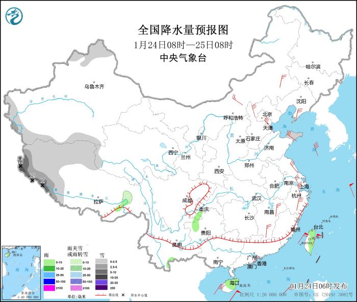 1月24日08時(shí)至25日08時(shí),新疆北疆北部和南疆西部山區(qū)、西藏西部、青海西部、山東半島等地部分地區(qū)有小到中雪或雨夾雪,其中西藏西南部局地有大到暴雪(10~18毫米)。貴州西北部、海南島大部、臺(tái)灣島中東部等地部分地區(qū)有小雨。內(nèi)蒙古大部、青海東部、河北北部、遼寧、山東半島、江蘇南部、江西、浙江等地有4~6級(jí)風(fēng),部分地區(qū)陣風(fēng)7~8級(jí)。渤海、渤海海峽、黃海大部、東海大部、臺(tái)灣海峽、臺(tái)灣以東洋面、巴士海峽、南海大部、北部灣、瓊州海峽將先后有7~9級(jí)、陣風(fēng)10~11級(jí)的大風(fēng)。