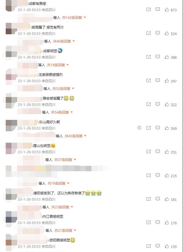 在該條微博下,四川成都、樂山等地網(wǎng)友表示有震感。