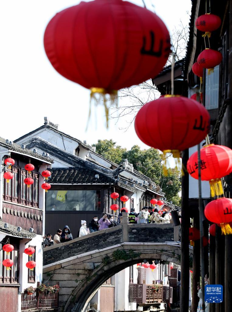 1月27日,游客在江蘇省蘇州市山塘街觀光游覽。