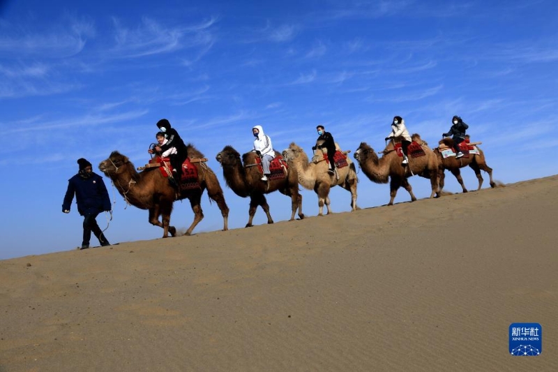 1月27日,游客在甘肅省敦煌市鳴沙山月牙泉景區(qū)騎駱駝游覽。
