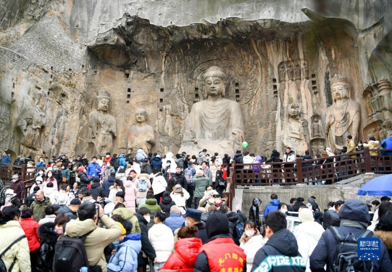 1月26日,游客在河南省洛陽市龍門石窟景區(qū)內(nèi)游覽。