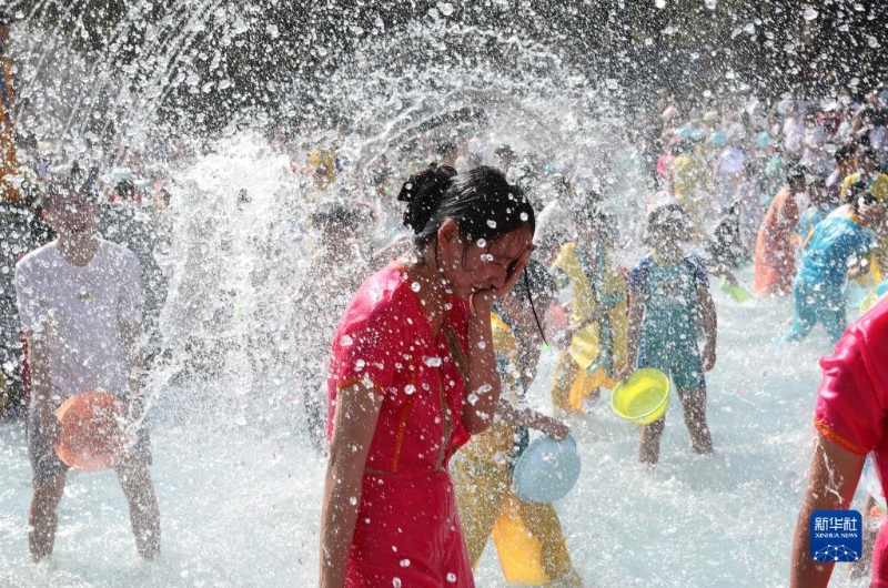 1月25日,游客在西雙版納傣族園景區(qū)參加“天天潑水節(jié)”活動。