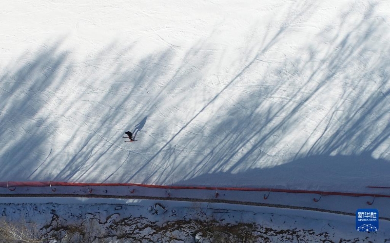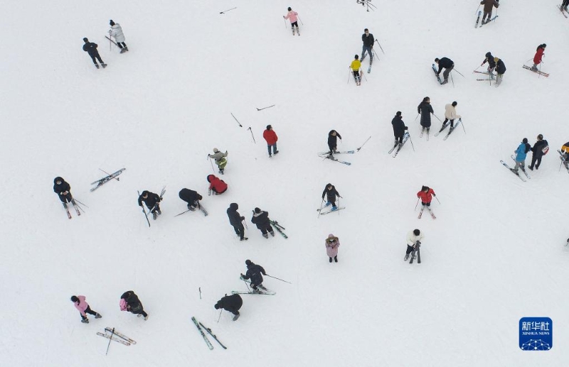 1月27日,游客在河北省灤平縣一處滑雪場滑雪(無人機照片)。
