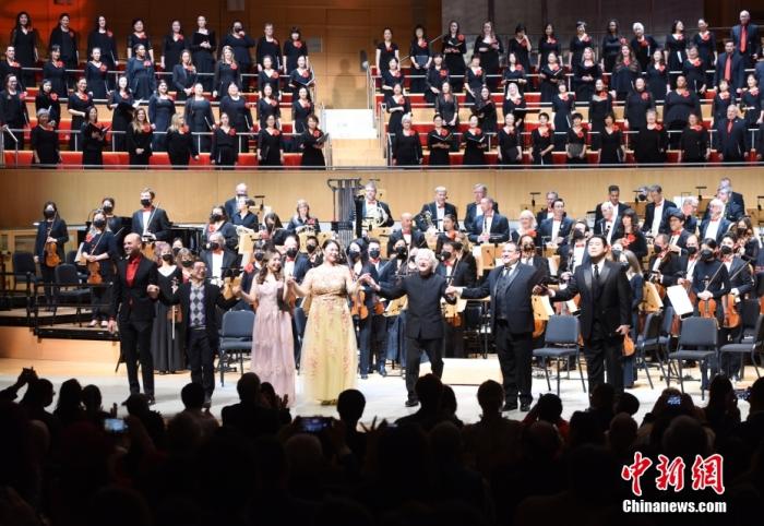 圖為指揮家卡爾·圣·克萊爾(前排右三)任當(dāng)晚音樂會指揮。 中新社記者 張朔 攝