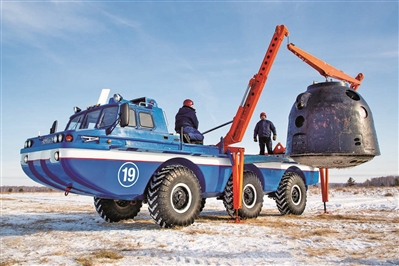 如今,隨著飛船返回艙著陸技術(shù)不斷成熟,著陸點偏離預(yù)定點的情況越來越少。在直升機的協(xié)助下,僅靠航天發(fā)射回收車就可以輕松找到返回艙,完成救援與回收工作。上圖中,藍色的ZIL-49061 PEM-2“藍鳥”航天發(fā)射回收車后部的吊運裝置,正將因穿越大氣層摩擦燃燒而變得黑黢黢的返回艙吊裝起來,運回指定地點。