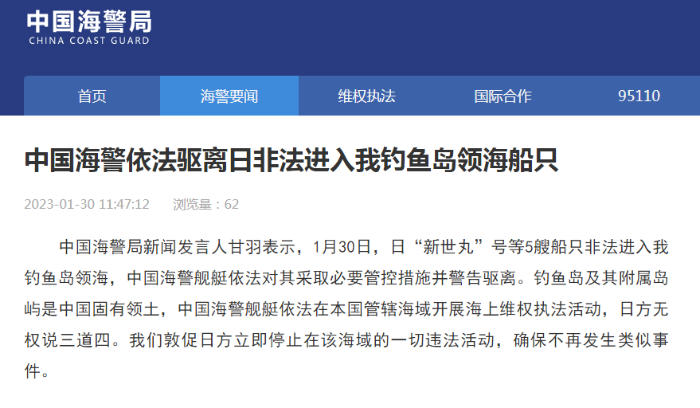 中國海警局新聞發(fā)言人甘羽表示,1月30日,日“新世丸”號等5艘船只非法進(jìn)入我釣魚島領(lǐng)海,中國海警艦艇依法對其采取必要管控措施并警告驅(qū)離。釣魚島及其附屬島嶼是中國固有領(lǐng)土,中國海警艦艇依法在本國管轄海域開展海上維權(quán)執(zhí)法活動,日方無權(quán)說三道四。我們敦促日方立即停止在該海域的一切違法活動,確保不再發(fā)生類似事件。