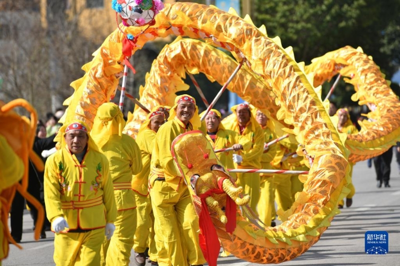 1月30日,在貴州省黃平縣新州鎮(zhèn),舞龍隊(duì)在街頭巡游。