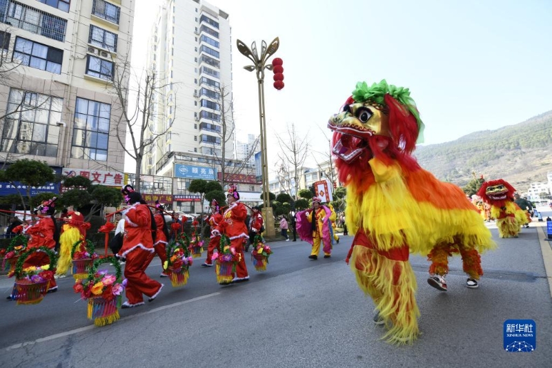 1月30日,在貴州省黃平縣新州鎮(zhèn),舞獅隊(duì)在街頭巡游。