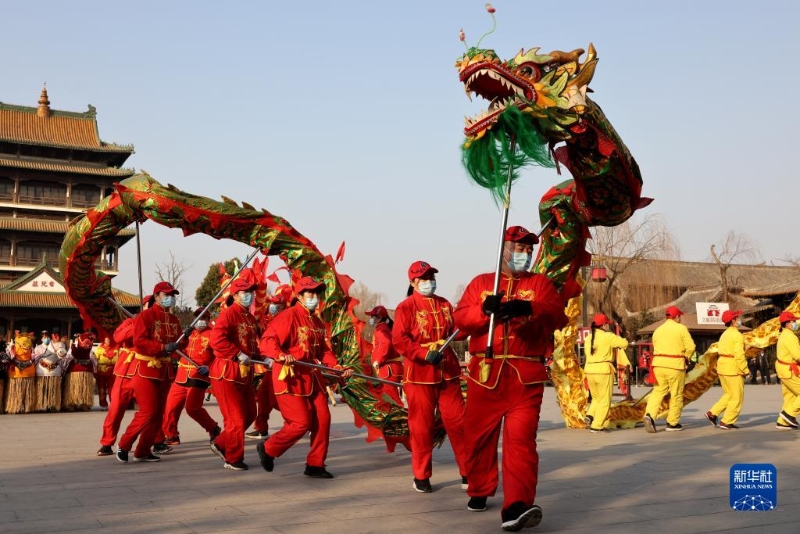 1月30日,在山東省棗莊市臺(tái)兒莊古城,民間藝人在表演舞龍。