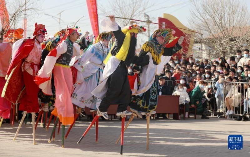 1月29日,在河北省滄縣舊州鎮(zhèn)賈村,民俗藝人在表演踩高蹺。