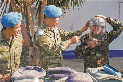 日前,柬埔寨維和友軍來到我第21批赴黎巴嫩維和多功能工兵分隊營區(qū),雙方圍繞掃雷排爆、應急防衛(wèi)等內(nèi)容進行了討論交流。圖為我維和分隊官兵向柬埔寨維和友軍展示掃雷裝備。