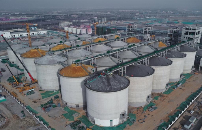 1月8日,工人在中央儲備糧秦皇島直屬庫有限公司海港糧食儲備基地項目建設(shè)工地施工(無人機照片)。新華社記者 楊世堯 攝