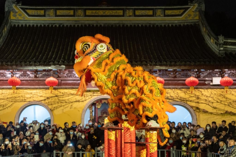 游客在江蘇省無錫惠山古鎮(zhèn)景區(qū)觀看舞獅表演(1月22日攝)。新華社發(fā)