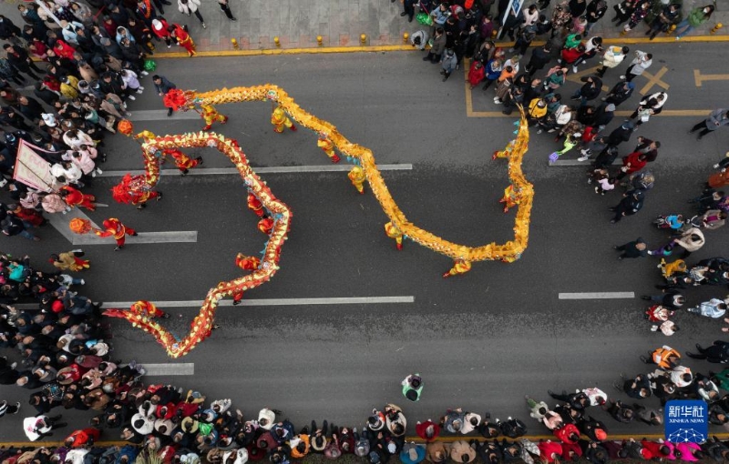 2月5日,居民在四川省瀘縣人民廣場觀看舞龍表演(無人機照片)。