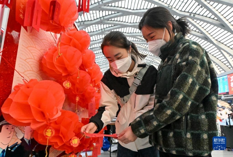 2月5日,在天津西站候車廳,旅客在猜燈謎。