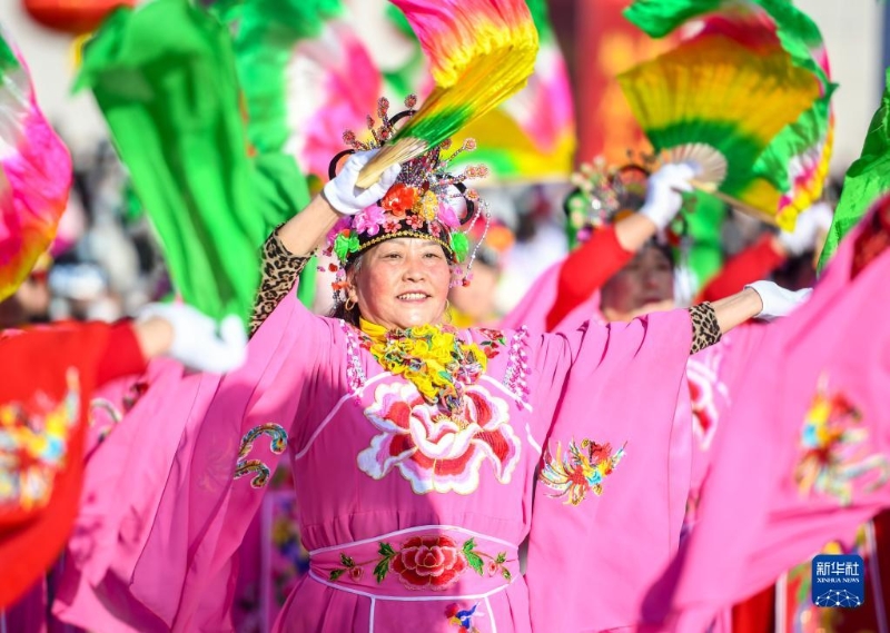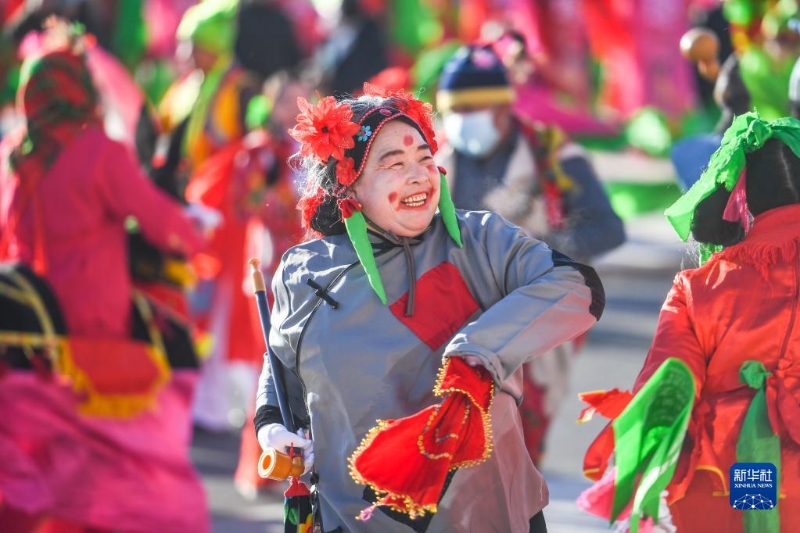 2月5日,在內(nèi)蒙古赤峰市巴林左旗,社火隊員在街頭表演。