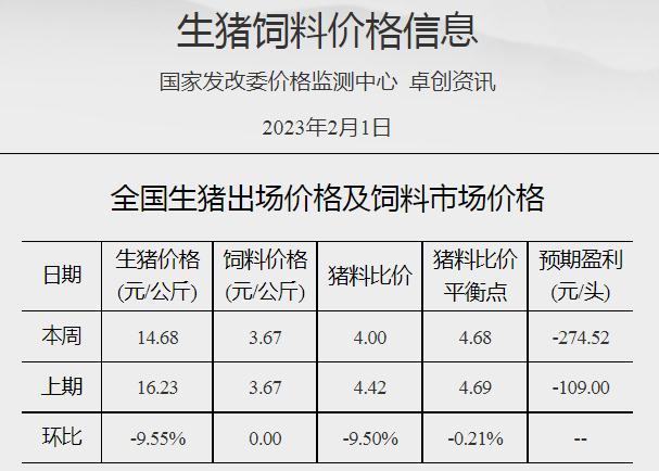 中新網2月6日電 據國家發(fā)改委價格監(jiān)測中心網站消息,截至2023年2月1日當周,全國豬料比價為4.00,較春節(jié)前(1月18日)下降9.50%。按目前價格及成本推算,未來生豬養(yǎng)殖頭均虧損為274.52元。當周國內豬價以降為主。隨著春節(jié)假期收尾,終端消費漸顯疲軟,屠宰企業(yè)開工率低位調整,整體收購難度不大,壓價情緒較濃,而養(yǎng)殖端雖有抗價情緒,但生豬出欄壓力仍存,周內豬價小幅走低。