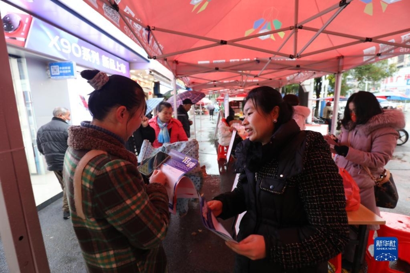 2月5日,在湖南省資興市鯉魚江片區(qū)舉行的2023年“春風(fēng)行動(dòng)”城鎮(zhèn)失業(yè)人員專場(chǎng)招聘會(huì)上,用工單位工作人員(左)發(fā)放招聘簡章。