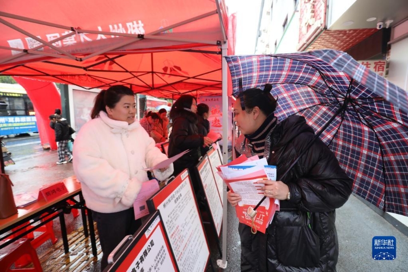 2月5日,在湖南省資興市鯉魚江片區(qū)舉行的2023年“春風(fēng)行動(dòng)”城鎮(zhèn)失業(yè)人員專場(chǎng)招聘會(huì)上,求職者(右)了解就業(yè)信息。
